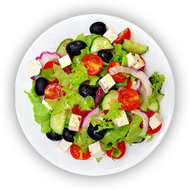Salade, tomates, olives. Servie avec sauce vinaigrette et pain offert sur demande.