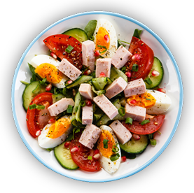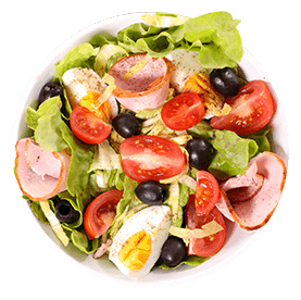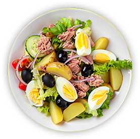 Salade, tomates, thon, pommes de terre, oeuf dur, olives. Servie avec sauce vinaigrette et pain offert sur demande.
