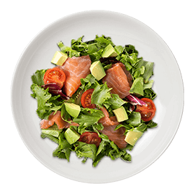 Salade, tomates, saumon fumé, avocat, citron. Servie avec sauce vinaigrette et pain offert sur demande.