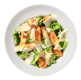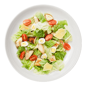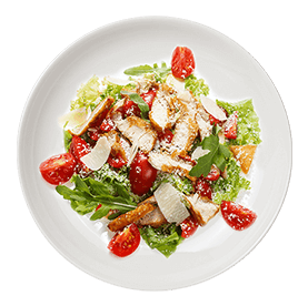 Salade, tomates, poulet, gruyère, olives. Servie avec sauce vinaigrette et pain offert sur demande.