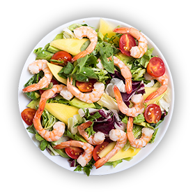 Salade, tomates, avocat, crevettes, citron. Servie avec sauce vinaigrette et pain offert sur demande.