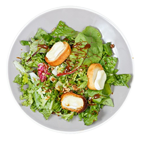 Salade, tomates, lardons, chèvre sur toast. Servie avec sauce vinaigrette et pain offert sur demande.