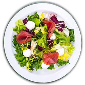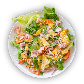 Salade, tomates, mozzarella en boules, jambon. Servie avec sauce vinaigrette et pain offert sur demande.