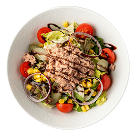 Salade, tomates, thon, maïs, oeuf dur, mayonnaise. Servie avec sauce vinaigrette et pain offert sur demande.